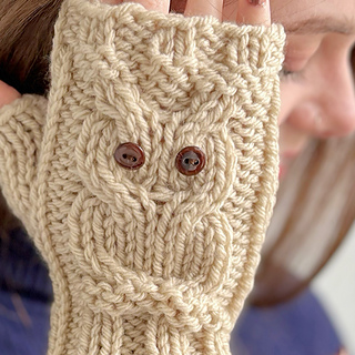 A lovely pair of owlies for you to knit! Each glove has a cable owl design on the back, and fingers are free for all those fiddly tasks. They are warm, thanks to the chunky/bulky yarn, and quick to knit up and are fantastic for that personal gift for Christmas and Birthdays.