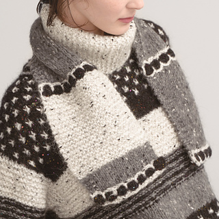 Wide stripes in black, grey and white. Scarf to cover crew neck. Features stripes made from reverse Stocking stitch constructed into a welt and stitches picked up again from a contrast grid crocheted over and through base of welt.