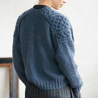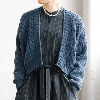 ボリュームのある大きなケーブルが印象的なデザイン、前立ての縁にはアイコードをあしらってしっかりさせます。肩下がりをつけた後ろ身頃と、まっすぐな前身頃の肩線をはぐことで、肩まで模様がきれいに続き、独特なシルエットが生まれます。