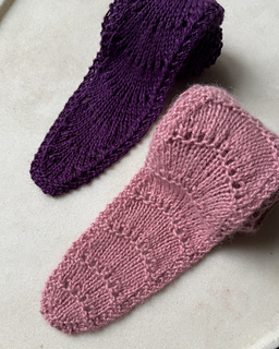 The Stockinette Version (purple sample) results in a smooth fabric; but the scarf will curve inwards due to the nature of stockinette stitches.