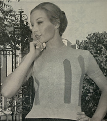 The panels are worked in a simple H.P. pattern, then sewn on to the jumper which features a ribbed neckline and set-in sleeves.