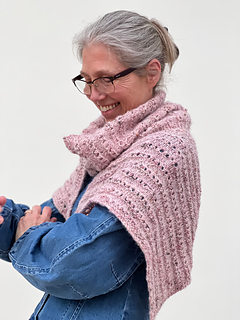 Large size shawl is shown in pink: yarn A shade Chantilly and yarn B shade Second Hand Rose.