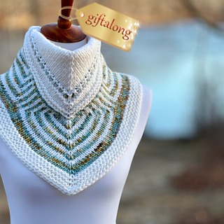 The Parapet Cowl begins at the top with an easy triangle of stockinette stitch. The triangle is then joined in the round, and a mosaic border is added, where a combination of stripes and slipped stitches allows the contrast color to shine through. Strategically placed increases create an eye-catching focal point and give the cowl a graceful bandana shape.
