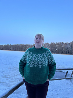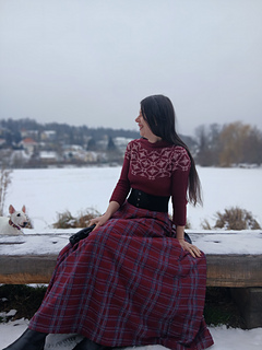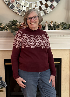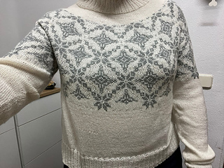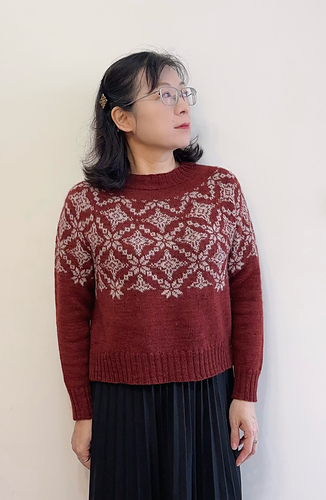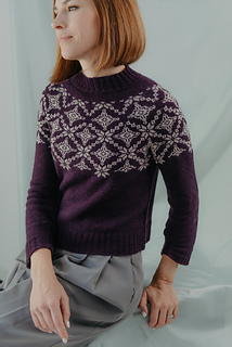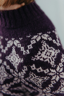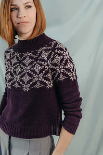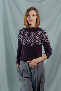 Notes: The sweater is knit in the round, starting with a cast-on at the neckline base. Increases are worked, followed by short rows to raise the back of the neck. Next, the contrast color is added, and the colorwork chart is followed up to the sleeve and body separation. The body and sleeves are then worked separately in the round. The body can be shaped or left straight, and the sleeves are decreased to the wrist. Both the body and sleeve lengths can be easily adjusted. The hem and cuffs are finished with a 2x2 rib and a stretchy bind-off. Finally, stitches are picked up around the neckline base to knit the neckband.