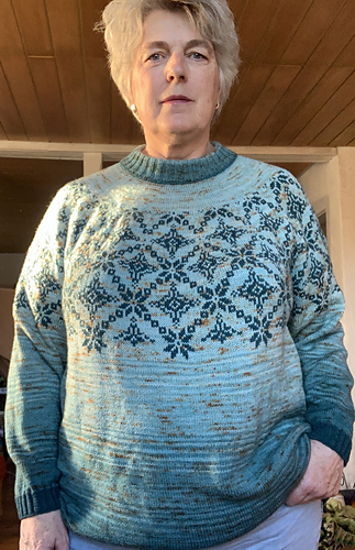 Techniques used: Knitting in the round, short rows, stranded knitting, lifted increases, Ladderback jacquard.