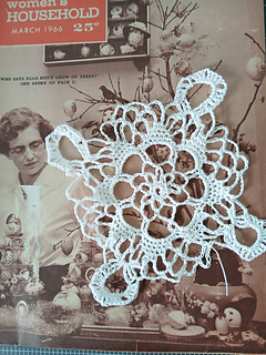 This motif measures 4 1/2 inches when done in bed-spread thread, can be done in finer thread for many articles around the house it makes an attractive all-over design - Elizabeth Hiddleson