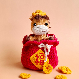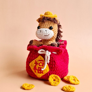 Crochet your own Peek-a-boo CNY Horse! Push it up to reveal a cute horse from the coin sack, and push it down to hide. This playful Chinese New Year amigurumi is sure to put a smile on your face. This will be a unique, original toy for you or a special gift for your loved one.