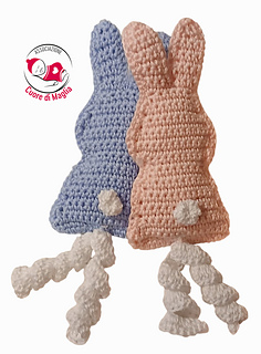 E’ lavorato in due pezzi uguali, completati da pochi dettagli (il viso ricamato, il pompon a catenella) e uniti con un giro di maglia bassa.