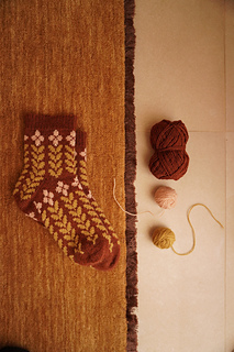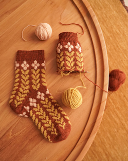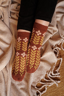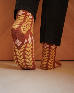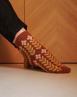 Contrast color 2 (leaf motif): 50 g of fingering-weight sock yarn is sufficient for all sizes. The exact quantity of yarn needed will vary based on your desired leg and foot lengths.