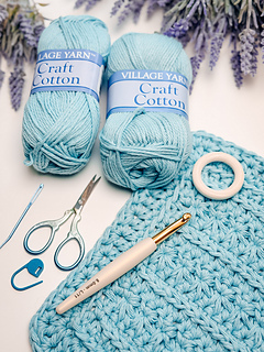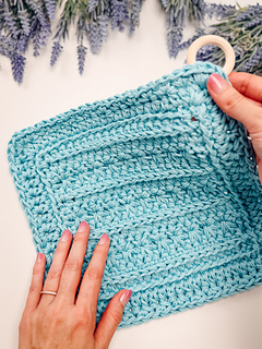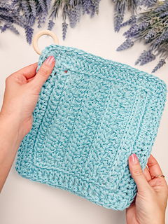 The trivet is worked flat in rows using the repeating 4-row Petal Loop Stitch pattern, combining simple and unique stitches to create the beautifully textured main body. The stitch pattern forms soft looped petals across the fabric, creating a striking design that looks intricate but quickly becomes rhythmic and relaxing to crochet. Once the main body is complete, the work is rotated, and a 3-round border is crocheted evenly around all four sides, beginning with a Clean sc round. In the final round, a wooden ring is attached directly to the trivet by working the final stitches around it, securing it in place so the finished piece can be easily hung for display or storage.