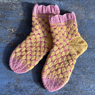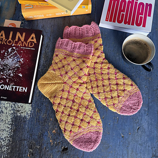 Primula er et par lune sokker i en varm gulfarge med rosa gittermønster og blondekant. De strikkes i hovedsak i et tynt, slitesterkt sokkegarn med nylonforsterkning, uten superwashbehandling.