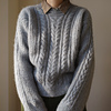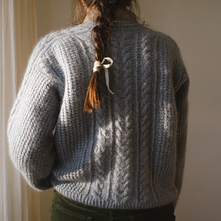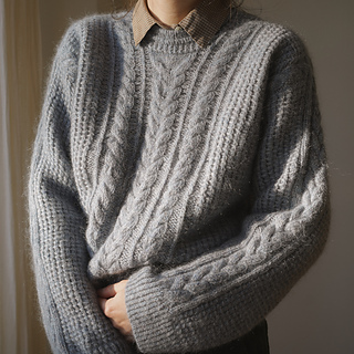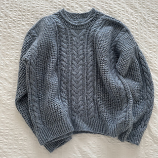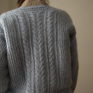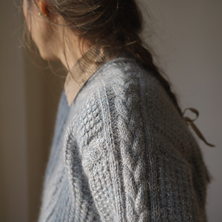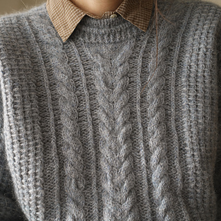 Its textured stitch pattern creates a bold, structured look, highlighted by a striking cable that flows from the saddle shoulder down the sleeve. The central panel showcases this cable alongside a series of finer, intricate ones, adding depth and refinement. Designed with a cropped silhouette, round neckline with a subtle decorative line, and a relaxed fit, the Philomena balances sophistication with modern ease.