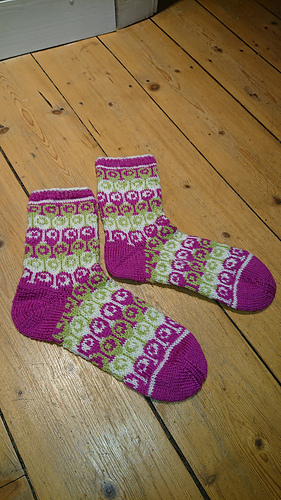 A colorful homage to Kaffe Fassett in simple stranded technique: only two colors a row and an easy to memorize geometric pattern with a little twist.