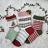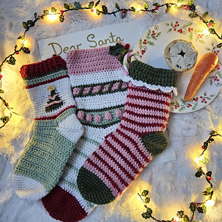 There are two sizes of stocking – small and large, three variations of foot pattern, options for fancy stripes and colourwork Christmas trees for the legs, three types of cuffs and embellishments!