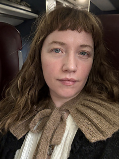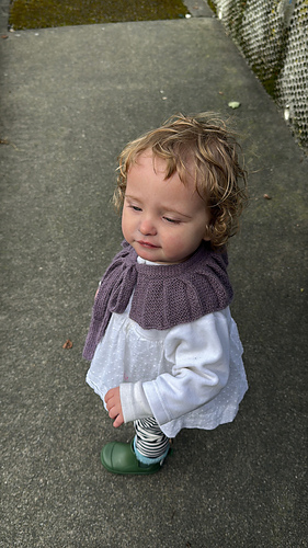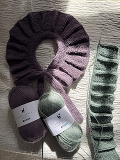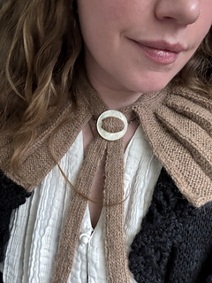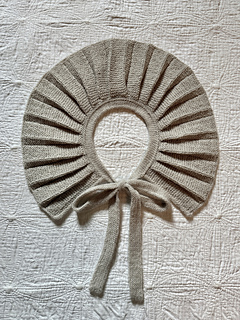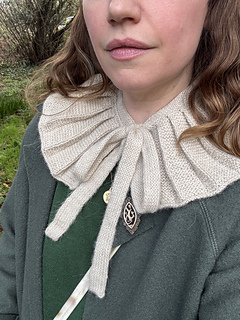 Knit primarily in garter stitch this simple collar employs a clever pleating technique to create volume around the neck. The tie is double knit for a pleasingly smooth edge.