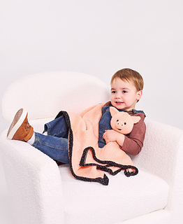 Both Blanket and Lovey Blanket are worked flat with a garter stitch edging. The components of the Pig are knit separately, flat, and then seamed together. The Pig is sewn to the center of the Lovey Blanket.