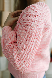 This is a cardigan design worked from the bottom up, flat. Once you reach the underarm area, the design is divided into three parts: one for the back and two for the fronts. Each part is worked separately, flat. They are then joined at the shoulders to begin working the sleeves.