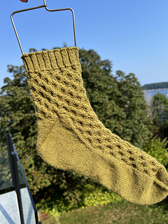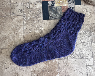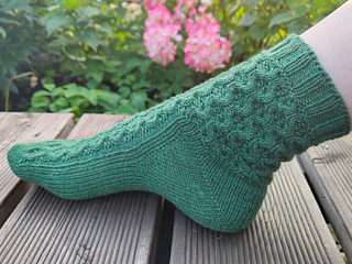These fingering weight socks are knit toe up with a Fleegle heel. Pino pattern decorates the instep and leg. Sewn bind off finishes the cuff. The instructions are written for the Magic Loop method.