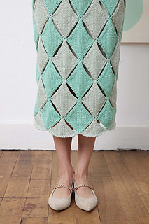 The skirt is knitted with the yarn held double throughout. The diamonds are knitted in rows of one color, working vertically from the bottom up and then joined at the sides.