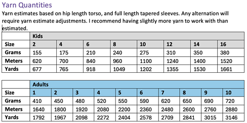 Yarn estimates based on hip length torso, and full length tapered sleeves. Any alternation will require yarn estimate adjustments. I recommend having slightly more yarn to work with than estimated.