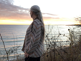 The start of a shawl can become a garment. This cardigan starts at the back of the neck as an isosceles triangle. Additional triangles are added to form a shape that will drape over the shoulders. Once the yoke measurements are achieved, sleeve and torso lengths are added, and the cardigan base becomes chevron. The base is squared off on both torso and sleeves and a ribbed band is added at the end for added texture and buttons, if desired.