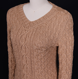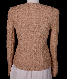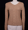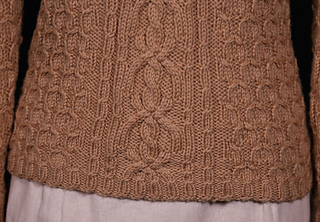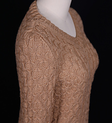 Working on this sweater at the start of a New England winter inspired me to prioritize warmth, so I chose a small, all-over, squishy cable pattern for the base of the body and sleeves. The bolder cable pattern in the center lent itself to inserting a V-neck split in its main cable. I selected a neutral-colored yarn to ensure that the sweater could be worn with bottoms of any color throughout winter. When the piece was finished, it reminded me of peanut butter fudge, which I purchase on my annual visits to the seaside town of Plymouth. I chose the traditional spelling of “Plimoth,” which is still commonly used around the town.