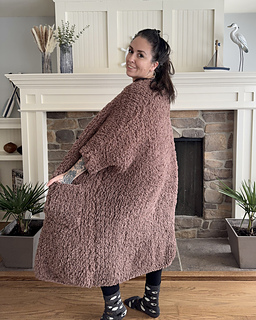 This pattern is an approachable, fast-knit project with thoughtful shaping and flexible sizing. The forgiving nature of sherpa yarn makes finishing stress-free, and the relaxed fit allows you to choose your size based on the amount of ease you prefer. Whether you’re lounging at home or layering up on chilly days, the Plush Blanket Cardigan is a warm, wearable knit you’ll reach for again and again.