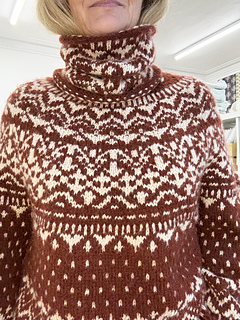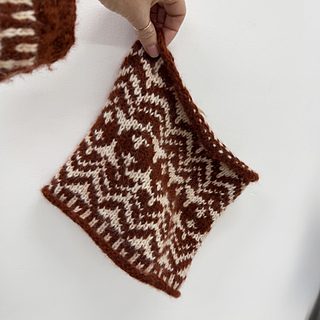 16 sts x 20 rnds to 4” / 10 cm on US 9 / 5.5 mm needles in Stranded Colourwork Patt, after blocking.