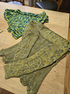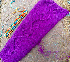 The Sweater is worked sideways for easy fitting as you knit. The cables run from the right sleeve up to and around you neck and down your left arm. The tiny leaves at the waist gives you camouflage and brings life to the hem.