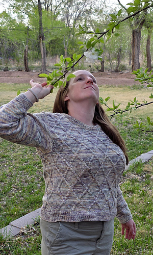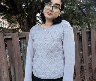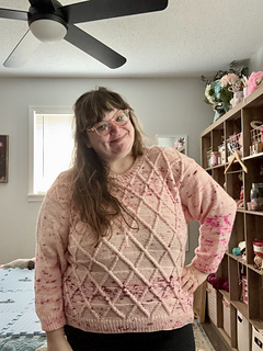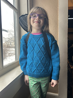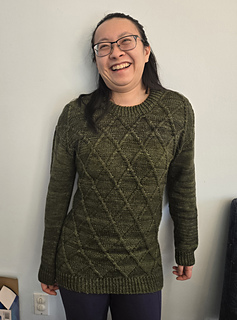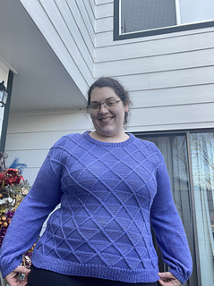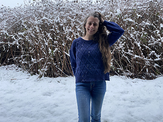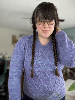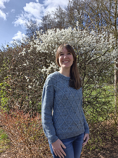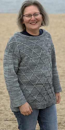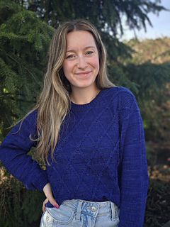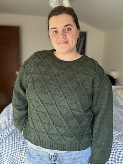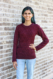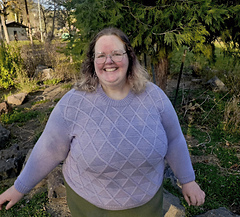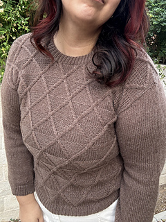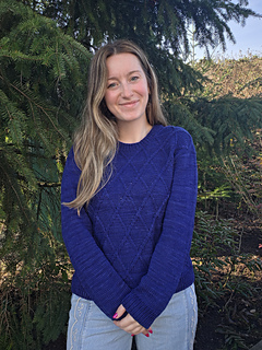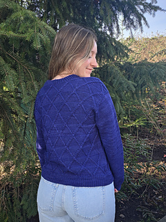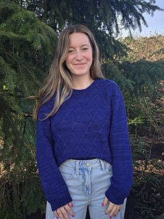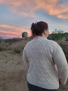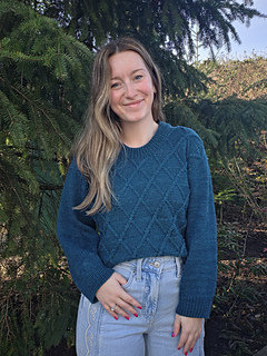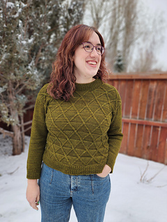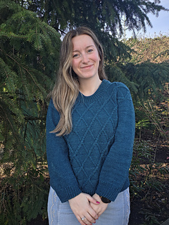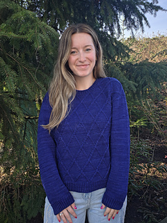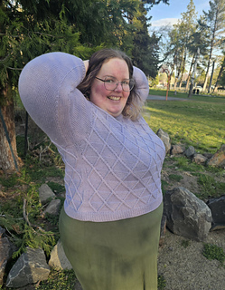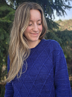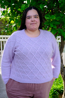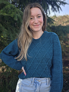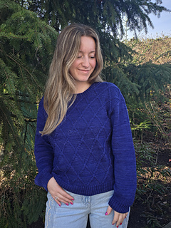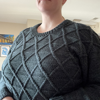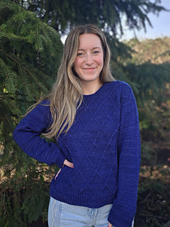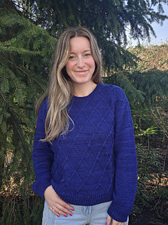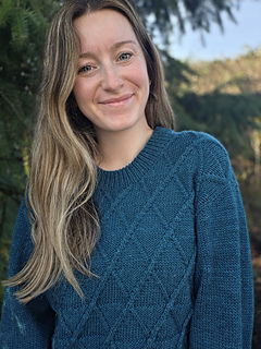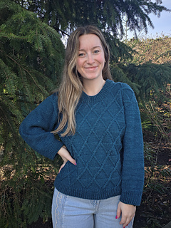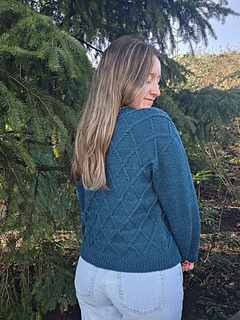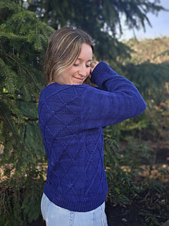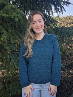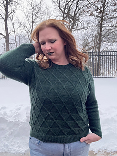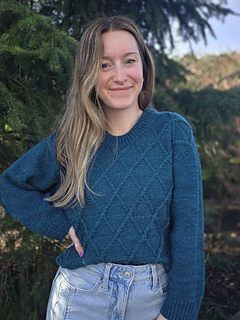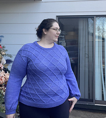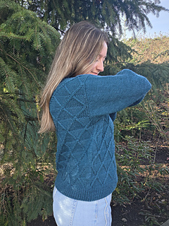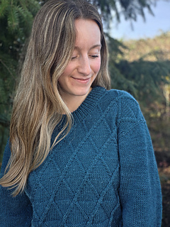 The Polar Latitude Sweater is an intermediate level DK weight sweater worked in a diamond cable pattern throughout the body and stockinette sleeves. It has a crew style neckline with a picked up collar, and is worked top down (flat for the armhole shaping, then in the round for the remainder of the body and sleeves) with a modified drop shoulder construction. The yoke section is worked at a smaller stitch count than the full bust (size dependent), and has some increases at the bottom, and underarm cast-on stitches to increase to the full bust measurement. The sleeves have a small amount of short row shaping at the top before working straight. The collar, cuffs and bottom edge have a 1x1 ribbed hem. The sweater is designed to fall to a high hip level. The pattern is intended to be a boxy fit, but has options for slight waist shaping if desired, as well as adjusting length as needed for the body and sleeves. This is a size inclusive design, written for 8 sizes (32-74 inch / 80-185 cm finished bust, in 6 inch / 15 cm increments) and designed for 2-8 inches / 5-20 cm of positive ease.