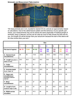 Note: The sizes reflect the FINISHED bust measurements in inches / cm of the sweater, and listed below you can see the recommended actual bust range for each size. The sweater is designed for 2-8 inches / 5-20 cm of positive ease. To determine the size you wish to knit, measure your bust and add 2-8 inches / 5-20 cm to find the closest size. If you are in between sizes, size down for a snugger fit, or up for a looser fit. My sample is knit with 7.25 inches / 18 cm of positive ease (Size 3 on a 37 inch / 90 cm bust and 30 inch / 75 cm waist).