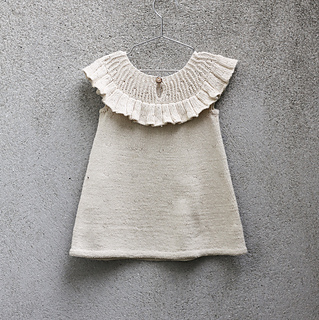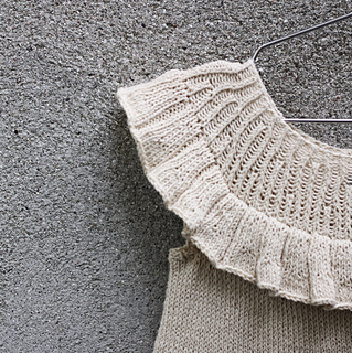 You start working back and forth to create the keyhole opening at back-neck. Afterwards, you continue in the round. Once the body is completed, stitches for the ruffle are picked up from the yoke and worked in the round in a simple ribbed pattern that creates the look of small pleats. Armhole edges are finished in ribbing.