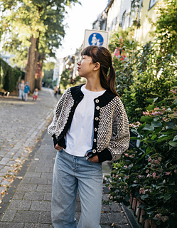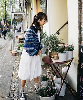 The cardigan is worked from the top down, from the collar toward the bottom hem and cuffs, seamlessly. The sample cardigan has a slightly cropped body, but please feel free to adjust the body and sleeve lengths to your preference, trying it on while knitting. The buttonholes are made “afterthought”, after you have finished knitting the front bands. You can thus choose the perfect buttons and decide the number of buttonholes matching your buttons by comparing a variety of buttons on your finished cardigan.