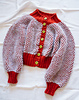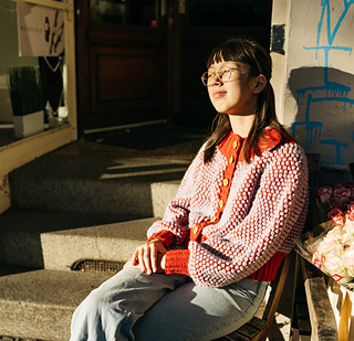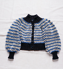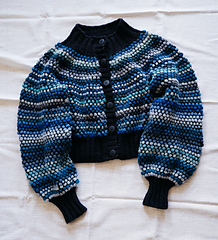 玉編みのように立体的なポップコーン模様を使ったカーディガンです. Fingering weight (ソックヤーンの太さ) の糸を2色使って編みます. 3本取りの糸で編む段と1本取りの糸で編む段を2段ずつ交互に編むことで立体的な模様が簡単に出来上がります. 1玉の毛糸から3本の糸を作りながら編み進めるので, 毛糸を3玉用意しなくても3本取りで編むことができます.