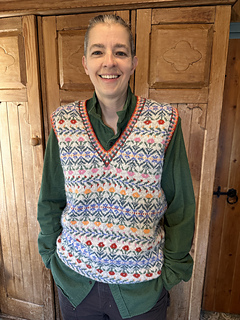 A ladies’ Fair Isle style vest in five sizes using eight colors of fingering weight Jamieson’s of Shetland “Spindrift” Shetland wool yarn, circularly knit in traditional style using steeks, with no reinforcement. This method demands traditional 100% wool yarn, preferably Shetland wool. Superwash wools and non-wool yarns are not suitable for this design, as written.