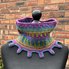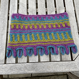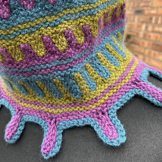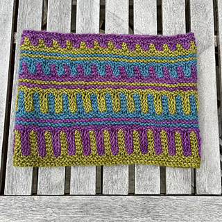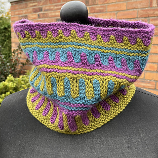 Prime Cowl is worked in the round using three colours of DK yarn. It uses the stacked stitches technique, exemplified by Xandy Peters, where multiple increases or decreases stack up on top of each other whilst only working with one yarn at a time.