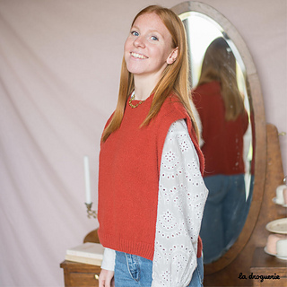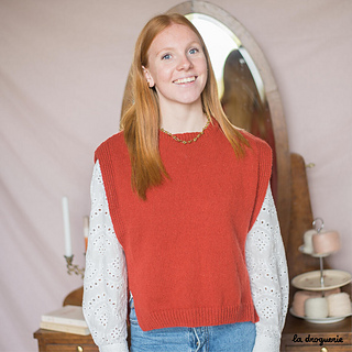 Pull sans manches en Caresse ou Duvet d’Anjou. Tricoté en jersey endroit et bordé de côtes 1/1 torses sur les côtés, le bas et l’encolure. Coupe droite ample avec encolure ronde, larges emmanchures et fentes sur les côtés. Ce modèle se décline en version col V plongeant et en robe tube avec col montant et poches plaquées sur le devant.