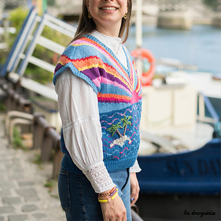 Pull sans manches tricoté en Fleur de coton (100% coton bio). Pull jacquard en all-over, col V, resserré à la taille par de larges bandes de côtes 1/1.