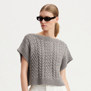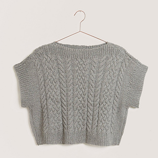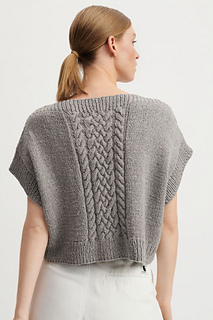 Der Pullunder aus Luxury Natural Silk Blend ist mit vielen Details versehen. Die beiden Zopfmuster des Vorderteils werden im Rückenteil von glatt rechts gestrickten Partien flankiert. Über die Schulterschräge laufen die 1-1-Rippen des U-Boot-Ausschnitts weiter.