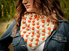 Envision a soft, oversized loop encircling your neck, alive with rounded, bobble-style pumpkins in sunny orange, each topped with a sprig of green “vine,” scattered playfully over a plush off-white canvas.