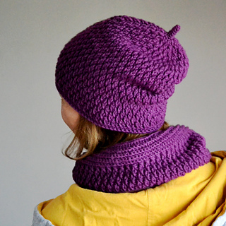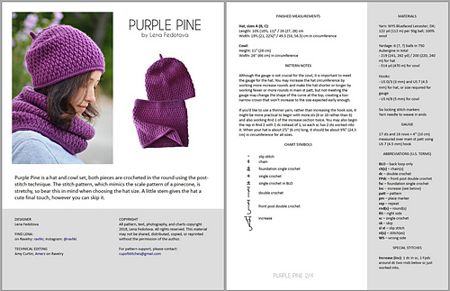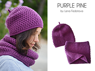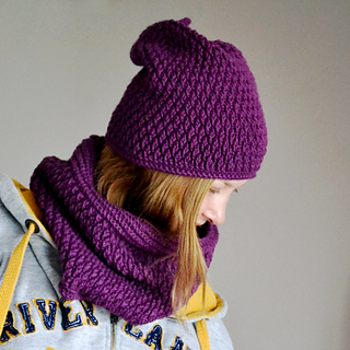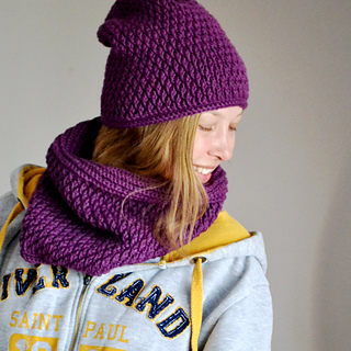 Purple Pine is a hat and cowl set, both pieces are crocheted in the round using the post-stitch technique.