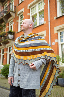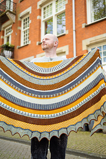 Choose five contrasting colors of fingering weight yarn to knit this large semi-circular shawl. The fabric is filled with fun stripes and slip stitches that form the geometric columns, checks, and triangles. Simple textures like ribbing, seed stitch, and garter stitch provide lots of relaxing rows to enjoy as you anticipate each new colorful stripe. The constantly shifting colors and textures make this project very addicting to knit. I used high contrast semi-solid and lightly speckled colors from Mominoki yarn for my shawl to emphasize the crisp architectural lines. Splashy speckles would also look really fun in this design for a more painterly effect.