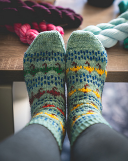 The Rain City Sock pattern occasionally uses slip stitches so you never have to work more than 2 colors at a time. This pattern has two heel options, the Afterthought or Shadow Wrap Heel, based on your preference.
