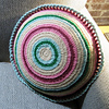 A circular pillow crocheted in the round with worsted weight yarn and a size F or G crochet hook. Yarn changed each row to avoid a seam, and colors changed to create a rainbow effect. Ruffle created with multiple chain rows.