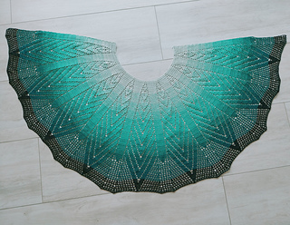 It can be made either in a long gradient or a single color. Blocking reveals the lace panels and the scalloped lacy edge.