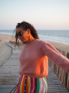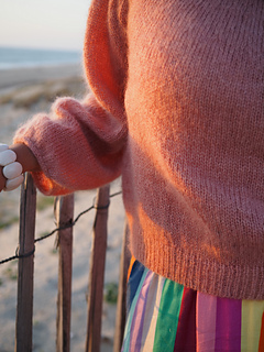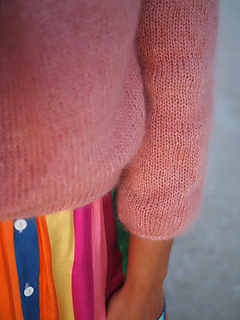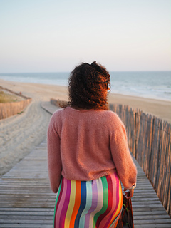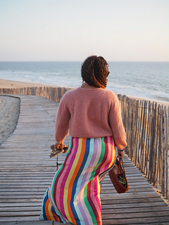 Rainbow Café se tricote de haut en bas sans couture avec une construction yoke. Le devant, le dos et les manches sont créés par un jeu d’augmentations. Les manches sont bouffantes. L’encolure et les bords de manches sont terminés par un icord.