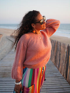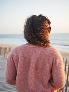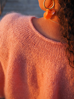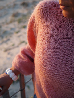 Le modèle est tricoté en KMS (72% mohair, 28% soie - 420 m / 50 g) de Yarn By Simone couleur Glory box.