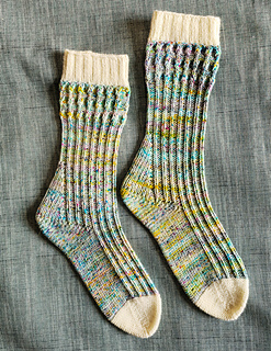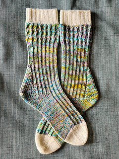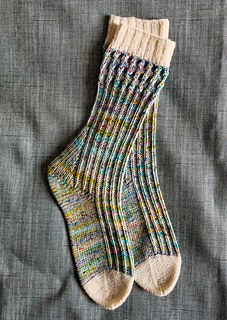 The socks are finished with a contrasting-color toe, worked in reverse stockinette, shaped with classic decreases, and closed using grafting for a smooth, seamless finish.