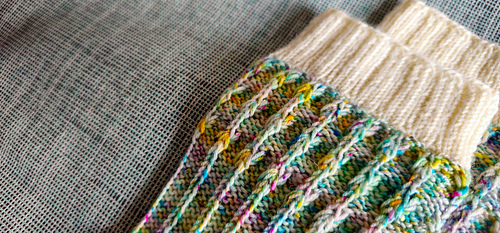 The Rainline Socks are worked seamlessly from the cuff down, combining textured details with a comfortable and structured sock construction. The cuff is knit in a contrasting color using a K3, P1 rib, providing elasticity and a neat, stable edge.