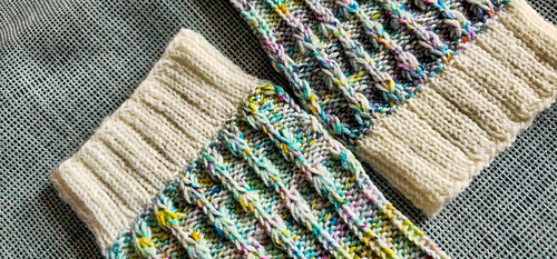 At the top of the leg, a textured raindrop stitch pattern is introduced. This motif is created by dropping stitches and pulling the working yarn through the laddered stitches, forming raised drops that resemble falling raindrops. After this section, the leg continues in a P3, K1 rib pattern, which visually echoes the look of falling rain and creates a flexible, textured fabric.